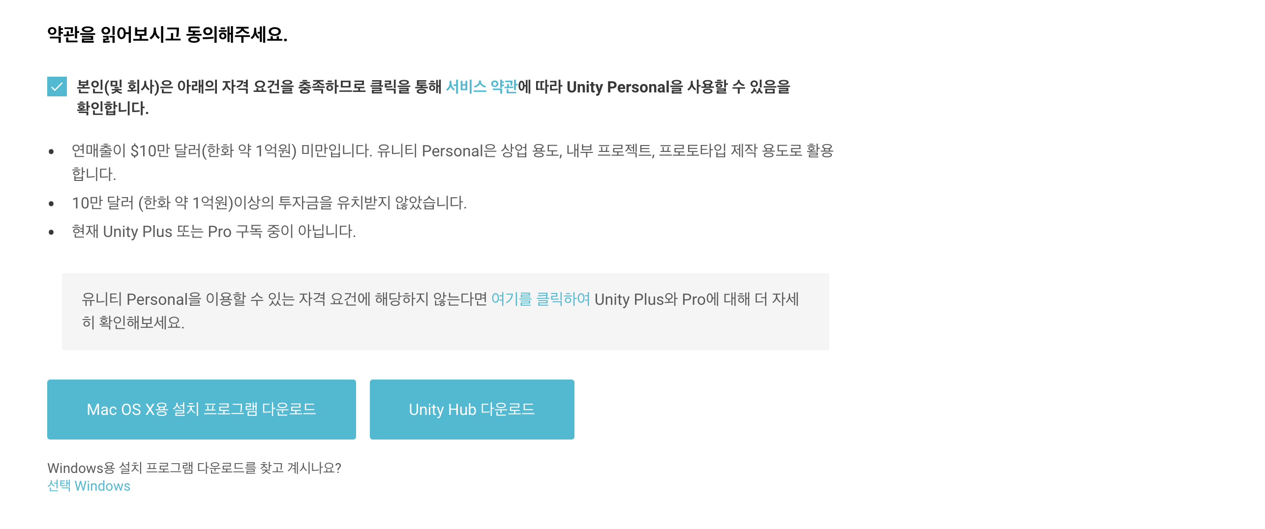 [Unity 약관 동의 및 프로그램 다운로드] 다음 화면에서 Unity를 무료로 사용할 수 있는 조건들을