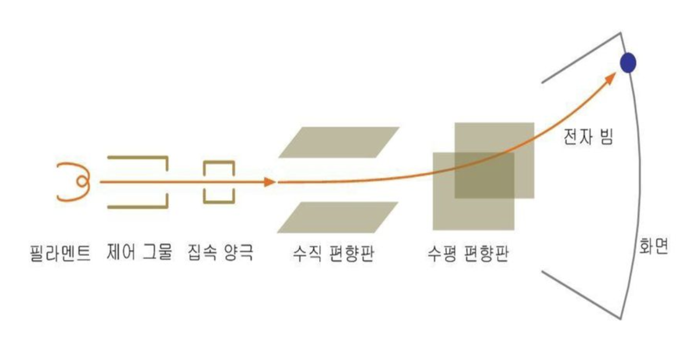 필라멘트에서 방출되는 전자가 전자빔(전자흐름) 형태로 화면쪽으로 끌려가게 되고,