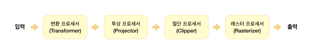 파이프라인은 입력과 출력 사이에서 그래픽 처리 작업을 기능별로 세분하여 이를 순차적으로 배치한 것입니다.