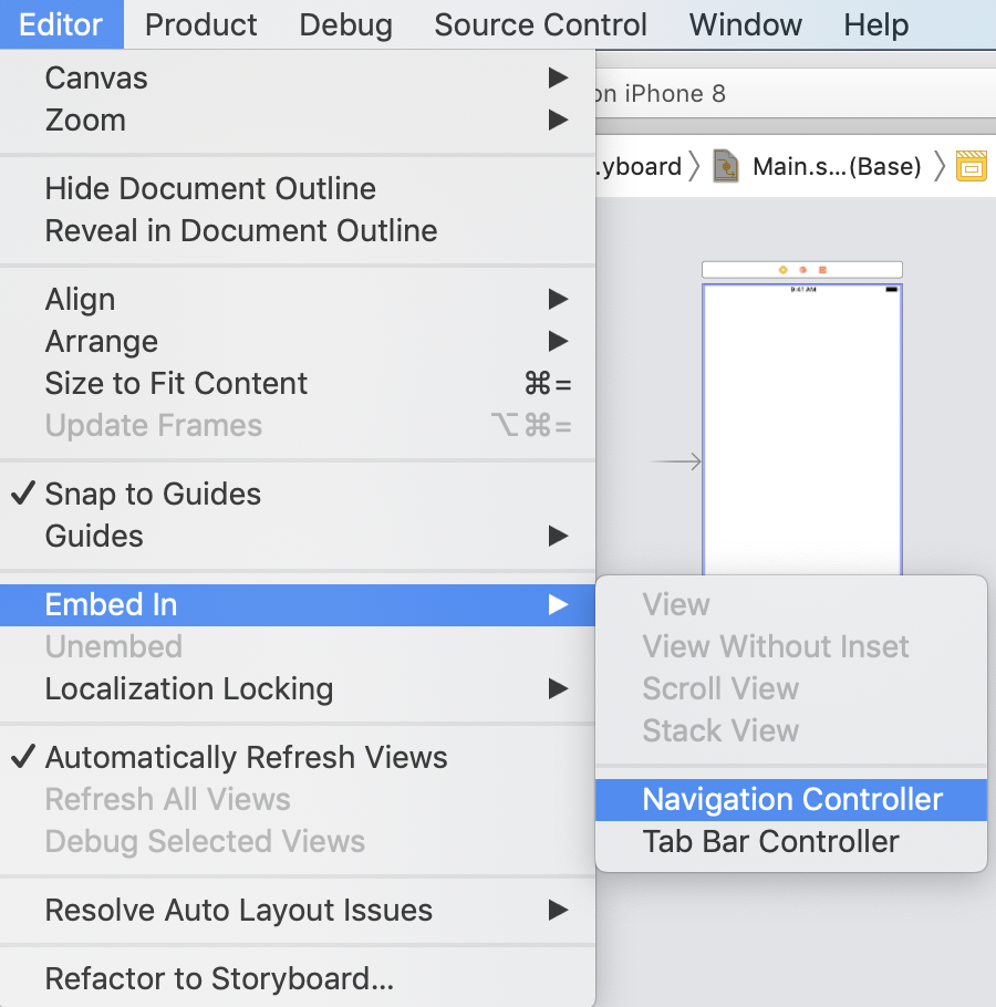 Editor > Embed In > Navigation Controller를 클릭합니다.